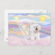 Um Bichon Frise experimenta suas asas entre as nuvens desfocadas do céu antes que elas sejam livres para entrar na Ponte do Arco-íris onde anjos e amigos esperam.l