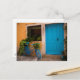 Uma bicicleta, uma porta e uma lanterna são pintadas do mesmo azul de Verão contra uma parede amarela em Rovinj, Croácia. Uma planta escaladora com flores cresce sobre a bicicleta azul e a janela. Esta fotografia evoca belos sentimentos de nostalgia. Este cartão postal é totalmente personalizável.