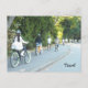 Uma captura divertida de um grupo de turistas a andar de bicicleta por um caminho.
