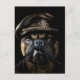 Retrato de cachorrinho de cachorrinho. Refletido nos olhos está o rosto de um gatinho assustado. O boné do motoqueiro preto diz "Sem Katz".