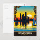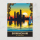 Sunset em Birmingham, prédios da frente d'água, Alabama. Barco à vela na água. Poster de viagens vintage ilustrada.