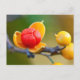 O primeiro agridoce oriental da estação do outono explode. Amoras amarelas e vermelhas coloridas, cobertas de orvalho, sobre fundo superficial de castanhos, verdes e amarelos