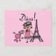 T-shirts, fatos de mergulho, canecas, bolsas, cartões, autocolantes, correntes-chave, travesseiros, relógios de parede, e muito mais, com uma design de diva fofa, com uma rapariga cabeleira negra num chapéu e um vestido cor-de-rosa, com o seu poodle rosa perto da Torre Eiffel!