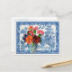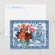 Flores coloridas em um vaso são posicionadas em frente a um desenho tradicional de salgueiro azul. Os padrões azuis do vaso ecoam as cores e o estilo do cenário inspirado no estilo asiático. As flores brilhantes têm um visual contemporâneo, embora tenham sido impressas em um cartão comercial antigo da era vitoriana. Essa bela imagem pode decorar convites, anúncios e o interior da sua casa.