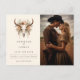 Boho Floral Skull Western Foto Salve a Data Convite/Anúncio Cartão Postal - Anuncie a sua data especial com um toque de charme rústico e elegância boêmica com o nosso Boho Floral Crânio Ocidental Casamento Salve a Data. Este convite/anúncio cativante combina a alegria sinistra de um crânio de vaca com a beleza suave das flores de tons de terra, criando uma justaposição impressionante que capta perfeitamente a essência de sua união única. Na vanguarda do convite, está sua foto favorita e um crânio de vaca lindamente adorado toma palco central, simbolizando força, resiliência, e o espírito do oeste selvagem. Ao redor dele, uma delicada variedade de flores de tons de terra acrescentando um toque romântico suave ao pano de fundo robusto. Revelar o convite revela uma surpresa encantadora - o verso dos recursos do convite inclui um código QR para o seu site de casamento e/ou RSVPs. Com a sua mistura de talento boêmico e charme ocidental, o nosso Convite para Casamento Ocidental Boho Floral dá o tom para uma celebração inesquecível de amor, unidade, e a beleza eterno da natureza.