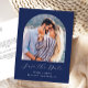 Este livro simples e minimalista Save the Date postcard apresenta uma fotografia em forma de arco acima das palavras "Save the Date" no elegante guião branco de escrita manual, seguido pelos nomes dos casais, pela data do casamento e pela cidade em sans serif num fundo azul marinho. Adicione seu endereço de devolução e texto adicional com mais informações ou detalhes no verso.
