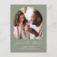 Este livro simples e minimalista "Salvar o cartão postal da Data" apresenta uma fotografia em forma de arco acima das palavras "Salvar a Data" em um guião elegante e branco, seguido pelos nomes dos casais, pela data do casamento e pela cidade em sans serif em um fundo verde sábio. Adicione seu endereço de retorno e detalhes adicionais na parte traseira, juntamente com um código QR para ajudar os convidados a visitar seu site de casamento.