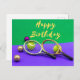 Bola de tênis com palavra aniversário feliz em um cartão postal verde e roxo