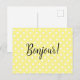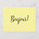Bolinhas em cartão postal amarelo com a palavra BONJOUR soletrada em bonito letras tipográficas. Francês para Alô.