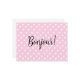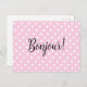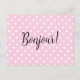 Bolinhas em cartão-postal cor-de-rosa com a palavra BONJOUR soletrada em bonito letras tipográficas. Francês para Alô.