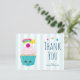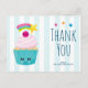 Cartão de agradecimento de aniversário com um fundo listrado de azul claro e branco. Sobreposto está um lindo cupcake azul com cobertura rosa e um rosto sorridente kawaii. Uma cereja no topo também tem um rosto fofo. Uma estrela cadente está voando no ar.