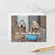 Este cartão postal apresenta uma fotografia de dois cães golden retriever sorrindo celebrando um aniversário ao ar livre, completo com um bolo de aniversário azul. Texto personalizável no verso diz "Vamos celebrar!"