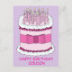 Um grande bolo de desenho animado roxo e rosa com várias velas em cima. As palavras 'Feliz Aniversário Primo' estão abaixo da imagem do bolo.