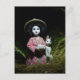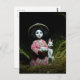 Bela boneca gerada por IA andando por uma trilha de floresta musgosa com uma criatura híbrida de gato e coelho