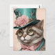 Uma bela cinza de um gato galhado com um chapéu azul com flores rosa