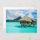 Cartão postal de um belo bangalô de lua de mel de telhado, que se encontra sobre-água, num resort na lagoa turquesa da ilha tropical Bora Bora, tendo em vista o Monte Otemanu, perto do Tahiti, na Polinésia Francesa. Veja também: