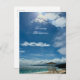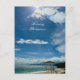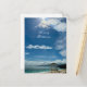A frente do cartão-postal mostra um pôr do sol radiante no horizonte de Boracay, pintando o céu de azul. Silhuetas de palmeiras se erguem contra o brilho quente, enquanto ondas suaves beijam a costa, refletindo a beleza fascinante da ilha.