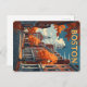 Um poster de viagens retrô captura uma encantadora cena da rua outono em Boston, com prédios históricos de tijolos e árvores vibrantes de folhas laranja sob um céu azul, e "BOSTON" ousadamente exibido no topo.