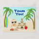 Este cartão-postal "Obrigado" apresenta um bebê de praia bonitinho a beber o seu limão. Ele está de pé com seus amigos do mar um caranguejo e estrela do mar, um impressionante castelo de areia e seu prato de surfe rodeados por palmeiras tropicais. Alguns gráficos em artwork©delightful-doodles.com e CherylSeslarDesigns.com em DigiWebStudio.com. *