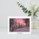 Cartão postal com um céu cor-de-rosa durante um pôr do sol sobre árvores de abeto cobertas de neve numa floresta em Lapland, no inverno, com uma fronteira branca, e o texto: "Lapland".