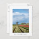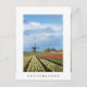 Cartaz vertical de uma paisagem com um moinho de vento e tulipas amarelas e vermelhas sob um céu nublado no campo holandês, num belo dia de primavera na Região do Bulb, nos Países Baixos com uma fronteira branca e o texto: "Países Baixos".