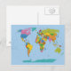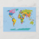 Mapa do mundo com nomes de países, nomes de cidades, grandes cidades, nomes de ilhas, nomes de mar e gratificações. Os países são representados em cores brilhantes.