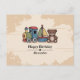 Um cartão postal de aniversário com ilustração de brinquedos de madeira artesanais: um trem, um veleiro e um ursinho em tons quentes, e textos personalizáveis, contra um fundo manchado suave: um presente agradável para uma criança ou amante de brinquedos de madeira!
