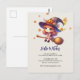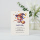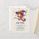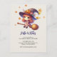 Este convite encantador de Halloween apresenta uma pequena bruxa adorável voando em sua vassoura, usando um chapéu de bruxa decorado com uma abóbora fatiada sorridente e flores coloridas. Rodeada por folhas de outono caindo, ela exala um clima caprichoso e mágico perfeito para convidar os convidados para a sua celebração de Halloween. A atmosfera fofa e divertida do design certamente estabelecerá o tom para uma reunião divertida e festiva.