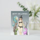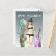 A bruxa bonito se posiciona com seus amigos engraçados e assustadores num cartão postal do Dia das Bruxas.