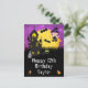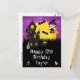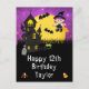 Este cartão de aniversário divertido e assustador pode ser personalizado com um nome ou título, como filha, neta, sobrinha, amiga, etc. Ele apresenta uma bruxa fofa ao lado de uma casa assombrada torta. Ao fundo, há uma lua cheia com morcegos e um céu noturno roxo com estrelas. O texto combina fontes decorativas e serifadas para uma aparência elegante e moderna. Isso é perfeito para o Halloween.