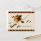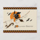 Uma ilustração bonita, preta, branca e laranja, de uma bruxinha velha, andando sobre a vassoura, sobre uma linha de roupa com toalhas e cobertores pendurados nela. A bruxa está atravessando uma lua brilhante, laranja, cheio, com um grupo de morcegos pretos. Na ilustração diz: "Saudações de Halloween", próximo a uma abóbora. A bruxa tem cabelo branco, um chapéu preto pontiagudo, e um vestido preto com um colarinho branco. Muito caprichoso e adorável. Excelente para aqueles que amam o Halloween, arte vintage, abóboras e bruxas. Veja meu compro, SpookyGhost, para mais presentes de Halloween.