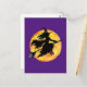 design colorida de uma bruxa cavalgando sua vassoura mágica em frente a uma lua amarela brilhante e ouro colorida.