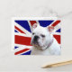 Mostrada é uma imagem fotográfica de um buldogue branco em inglês diante de uma bandeira britânica.