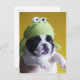 Um cachorrinho francês com um chapéu de crochê sapo.