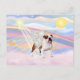 Um Bulldog Inglês, castanho e branco, tenta suas asas entre as nuvens flufficadas do céu antes que eles sejam livres para entrar na Ponte do Arco-íris onde anjos e amigos esperam.l