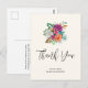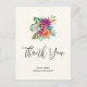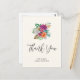 Cartão de agradecimento, com um arranjo de flores contendo lindas rosas rosa, laranja e branca cercadas por folhas verdes.
