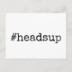 Este design direto vai direto ao ponto. Em uma fonte amigável de máquina de escrever, coloquei "#headsup" no centro da frente. Talvez você queira uma hashtag diferente. Isso é uma opção! Ao contrário, há uma configuração mais tradicional com campos adicionais para uma variedade de detalhes importantes. Altere qualquer um desses campos à medida que você vê o ajustado. Você também pode alterar as cores da fonte e do plano de fundo se desejar.