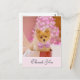 Obrigado postal com um adorável cão de Natal vestindo uma bela gravata de arco rosa-xadrez. Este pequeno animal de estimação está sentado dentro uma caixa de chapéu branco. Uma árvore branca decorada com luzes cor-de-rosa no fundo. As luzes estão desfocadas, o que lhe dá um efeito mágico de boque. Foto tematizada de Natal querido. Perfeito para amantes de cães.