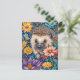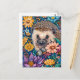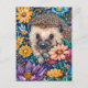 Desenho bonito de um ouriço sentado em um leito de flores com muitas flores florescentes, cercado por cores vibrantes.