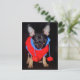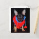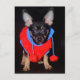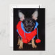 Foto retrato adorável de um pequeno filhote vestindo um suéter de lã vermelho e azul suave com pom poms.