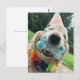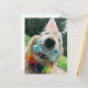 Envie cumprimentos especiais de aniversário com este cartão fofo! O design apresenta uma fotografia de um cachorro golden retriever feliz que está usando um chapéu de festa e segurando um biscoito em forma de osso com a inscrição "feliz aniversário" na boca. O texto personalizável no verso diz "Espero que seja um bom!"