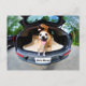 Cachorros engraçados indo para um carro movendo cartão postal. Adorável como Chihuahua e mestiço de raça canina. A citação 'Estamos Movendo' escrita na placa de licença pode ser personalizada. Imagem copyright Marg Seregelyi Fotografia.