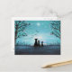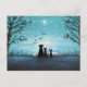 Dois cachorros e uma silhueta de gatos assistindo o pôr do sol numa noite de inverno. Em cores azul, preto e branco. Com duas árvores de ambos os lados e pássaros voando em direção ao pôr do sol. Flocos de neve caindo e um casal de estrelas brilhantes no céu. Cenário de inverno Arte Original de Pintura Acrílica feita por Donna Leger para Designs de Ironia. Todos os Direitos Reservados