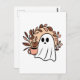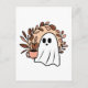 Cartão postal do fantasma e café. Cartões bonitos de outono. Ilustração bege, marrom e rosa com um fantasma bonito segurando uma xícara de café. Cartões estéticos de outono.