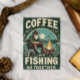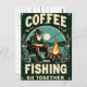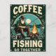 Uma ilustração retrógrada mostrando um pescador sentado em uma fogueira com uma haste de pesca e uma xícara de café, com o texto Café e Pesca Ir Juntos exibido de forma destacada.