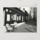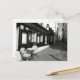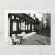 Cartão-postal com fotografia a preto e branco de um café em Montmarte com assentos e mesas no lado da rua. Esta foto é parte da minha série de fotos de Paris.