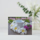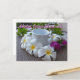 Envie um cartão postal havaiano bonito com saudações de aloha do Havaí, apresentando uma xícara de café Kona cercada por plumerias.