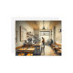 Presente perfeito para o amante de viagem e café. A pintura aquosa ilustra o modesto e prático interior de um pequeno compro de café em São Francisco. A decoração é minimalista, com mesas e cadeiras de madeira simples, dispostas de forma simples. As paredes bege claro são enfeitadas apenas com itens funcionais como um menu de quadro e um relógio. O pequeno contador está limpo e segura uma máquina de café expresso ao lado de potes de açúcar e de agitadores. Os patrões tomam café com canecas brancas simples ou de papel, alguns imersos em jornais enquanto outros calmamente trabalham com laptop. A luz natural flui através de uma pequena janela, acrescentando um calor suave ao ambiente imprudente e prático do espaço.