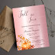 Na frente: Um Chá de panela moderno, elegante e simples para o outono. Um fundo metálico rosa dourado falso. Decorado com uma abóbora ouro, folhagem e algumas flores brancas. Modelos para a noiva ser o nome, data e local do chá. O texto: Fall in Love é escrito com um grande estilo escrito à mão, letras escuras rosa douradas. Fundo: fundo de folha rosa de ouro falso e uma abóbora. Dica: Se você não quiser que pareça um cartão postal, clique em personalizar, vá para o verso e remova o divisor e o carimbo de posto.