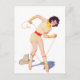 Imagem de pin-up de uma era clássica. Uma imagem divertida e sombria de uma pose retrorreflectora. A vovó é apanhada nos seus próprios cadarços enquanto tenta amarrar as botas.